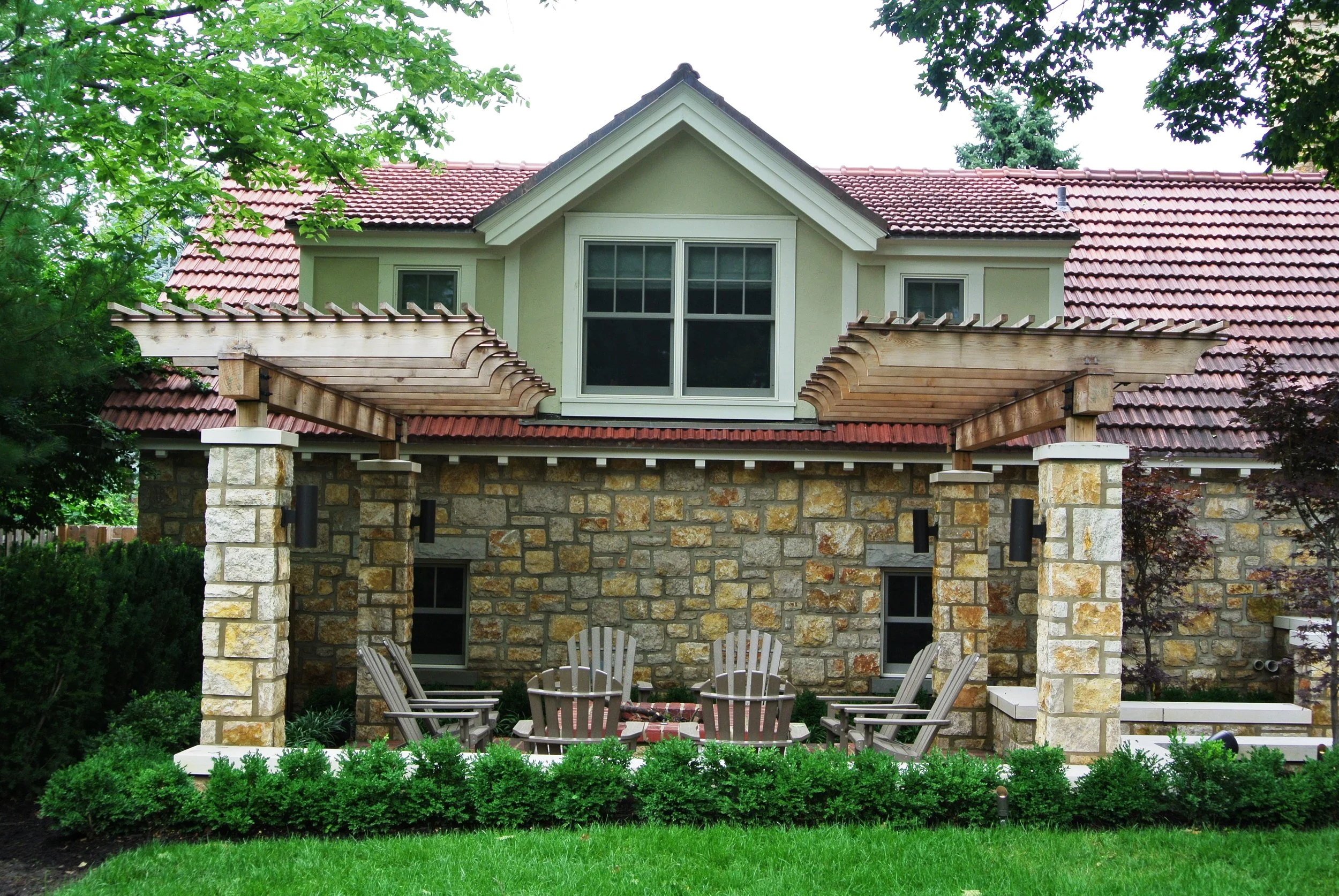 Westover Residence : PLAID’s design solution for this colonial estate prescribed a series of well-conceived outdoor spaces seamlessly integrated with the architectural style and functions of the building. The spaces accommodate a range of family activities, and include a casual gathering area with outdoor kitchen and overhead pergola; a large dining plaza; and a semi-private space with fire pit, outdoor sculpture, and twin pergolas. The material palette of limestone, bluestone, and brick (for walls, columns, paving, and steps) extends the building materials into the site. New plantings provide spatial definition and seasonal interest throughout the property.